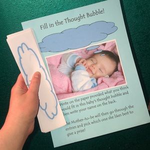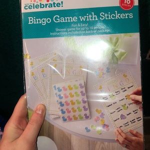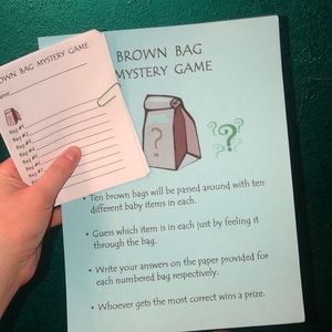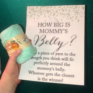 Comes with four babyshower games with items needed. Will come with 6 diapers to go with do I smell a dirty diaper game. Will come with white paper bags to go with the brown bag mystery game. Brand new still in package bingo game. Comes with pre printed sheets of paper for each game, how big is mommy’s belly game come with a brand new roll of aqua yarn 💙💚 also comes with a banner💚💙 free gift with purchase !! I also have little boy clothes in my closet 💙 bundle for a deal ☺️🥰