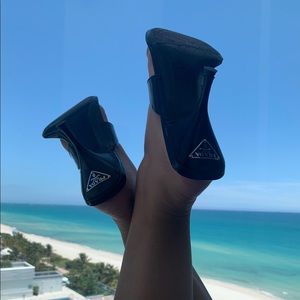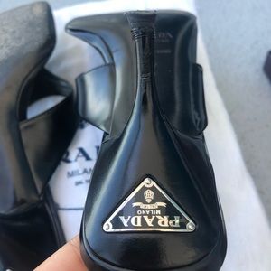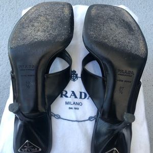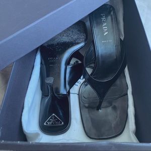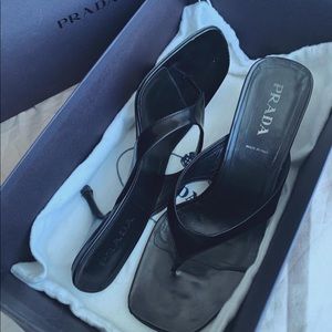 Thong/flip flop style kitten heels mules. Black patent leather, square toe, 2 inch heel with Prada plaques on each heel. Some scuffs on heel as pictured, not at all noticeable. Run true to size.