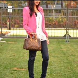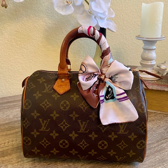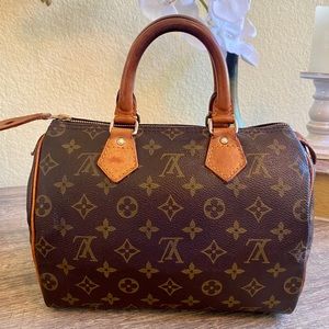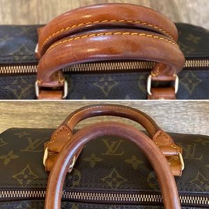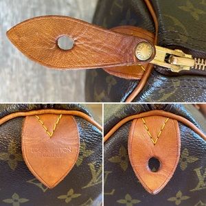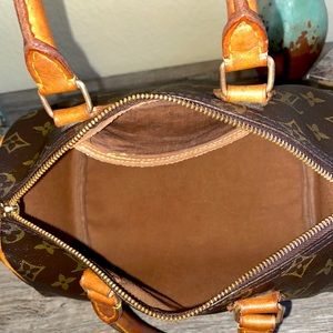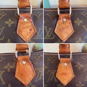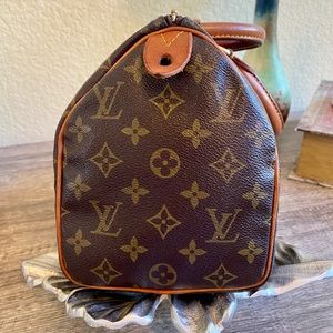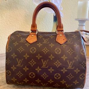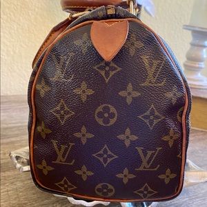 Authentic LV Speedy 25. Vintage in beautiful condition for its age. Piping and leather tabs are intact. Leather has a dark honey patina throughout with darkened areas and some creasing (see pic). Handles are sturdy with no shape loss, light superficial cracks, hardly noticeable (see pic). Zipper works perfectly. Interior is in great condition, clean with no stains