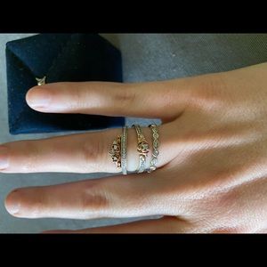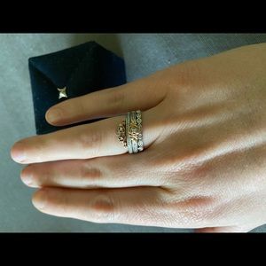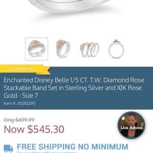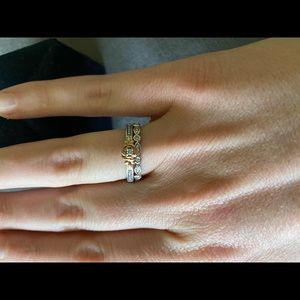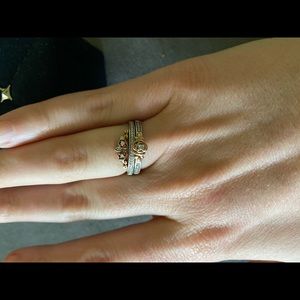 Three piece Zales Belle ring set. Original box included. Sized at a 7. Sterling silver with rose gold accents. This set has been worn and shows some signs of wear in small scratches on the bottom of the bands. Otherwise in great condition!