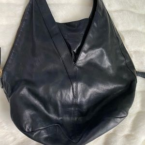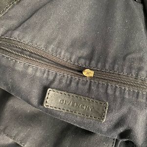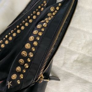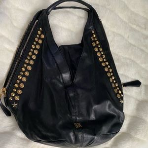 GIVENCHY "Tinhan " hobo bag by Riccardo Tisci comes in black leather with dual gold tone zip sides, metal logo, and gold tone stud and spike embellished sides. The inside zipper is missing the zipper puller, but the outter zipper is perfect, Minor wear. Good Pre-Owned Condition