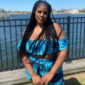 Two peice off shoulder swim wear with matching shorts. It’s cute as a swimsuit but I think it works better as a two piece outfit for a casual day out.