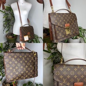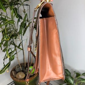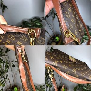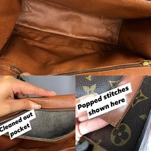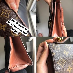 Top handle is in good condition. It is sturdy at both ends. There’s just a few light spots on it. There is a tiny bit of popped stitches near the top pocket front pocket. Hardware has normal sign of wear. The canvas does have a very small amount of cracking on some areas near the edges. Glazing does have some wear. Interior has a few marks. Interior zipped pocket was cleaned out to reveal soft fabric. The strap does have signs of wear.. no major issues and it is sturdy.