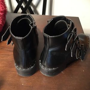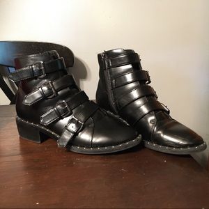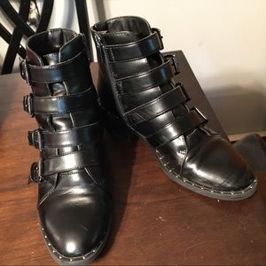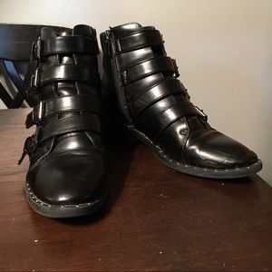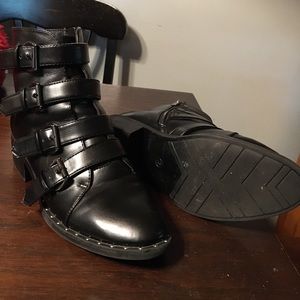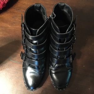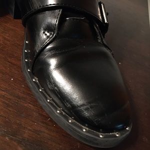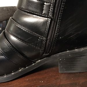 Gently used- I love these so much, they have a short wedge heel and soft inner padding. I didn’t wear them enough to justify keeping them 😢 They have slight scuffs & small white specks (pictured). Can most likely be removed/cleaned. They’ve been in my closet for a bit, so they may be a bit dusty/stray cat fur! I cleaned them the best I could 🙂 gunmetal buckles and faux leather finish. Unsure of brand- bought at Target. Seems to say “new day” inside sole.