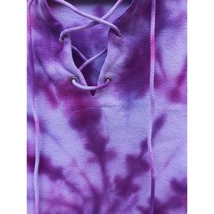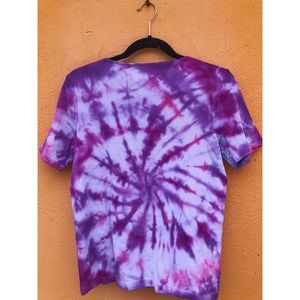 tie-dyed by ME using purple, pink, & magenta colors, size unknown but can fit a M/L, 100 % cotton
