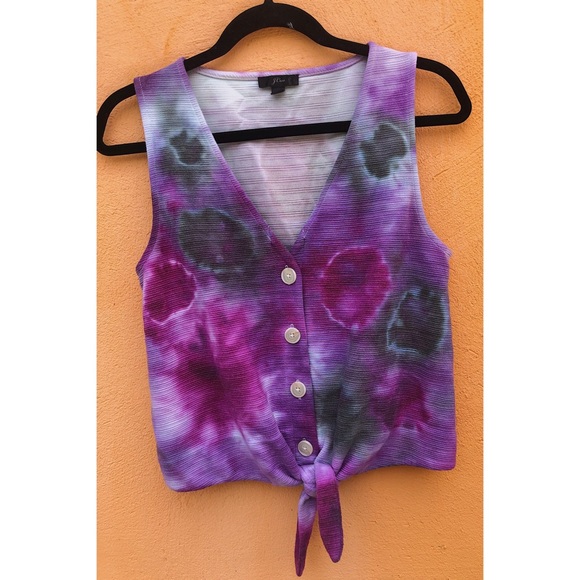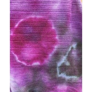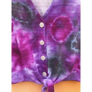 tie-dyed by ME using purple, magenta, & black dye, button down center & tie in front, material is great quality & durable, colors are bold & WON’T fade