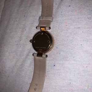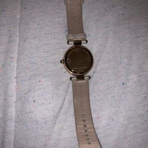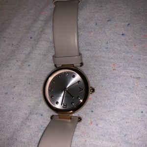 Beige leather band with rose gold hardware. Battery needs to be replaced. Only flaw is the normal wear shown inside on the band, other than that nothing is noticeable when worn.