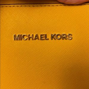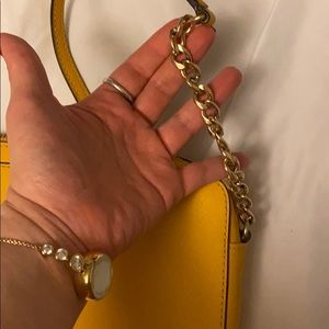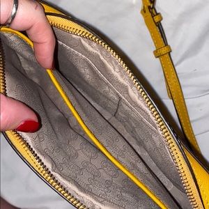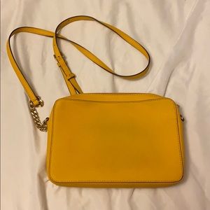 Bright yellow. Crossbody. Super cute. Slight discoloration from wearing with new blue jeans on back. Pictured.
