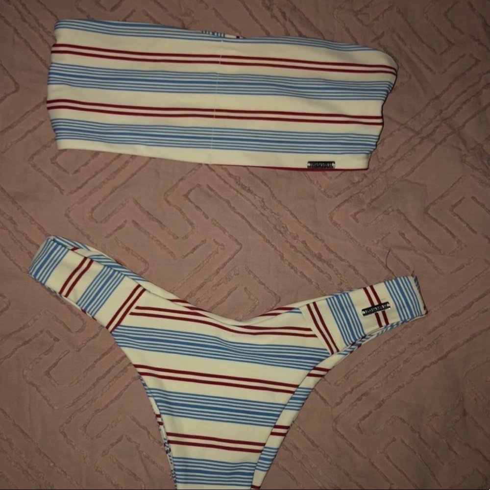 cream color w white and red stripes. the back has 3 straps going across. high leg cut and cheeky. orig 80 + 16$ shipping