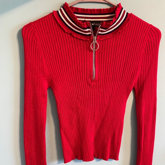 Red zip up sweater with circle zipper. Red, white, and blue details on collar and sleeve. NEVER WORN