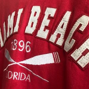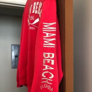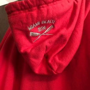 Pink Miami Beach hoodie. Small mark on the front, may come out with a stain remover. Pictured above. Otherwise good condition. Cute design on the sleeve and hood.