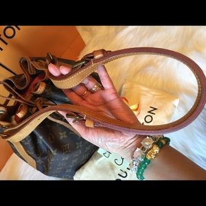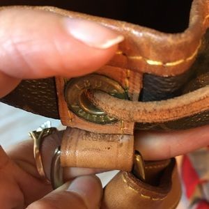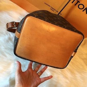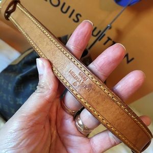Excellent with mininal water marks on leather, some spots inside, it has two super tiny hairlines on the bottom leather of the bag(pictured)