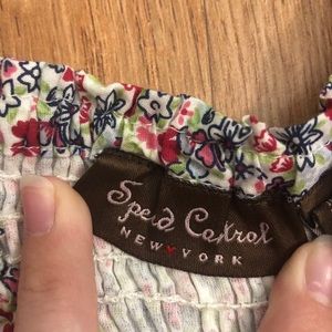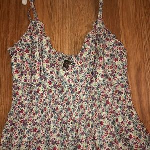 cute flower patterned mini dress in great condition. has adjustable straps. the back and right above the waist is the material that cinches in to make it stay up better.