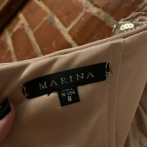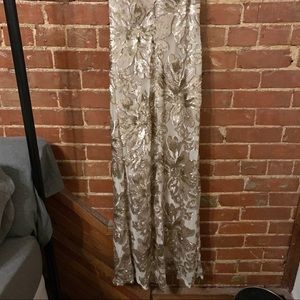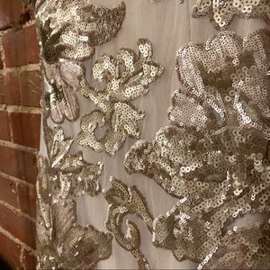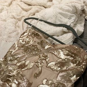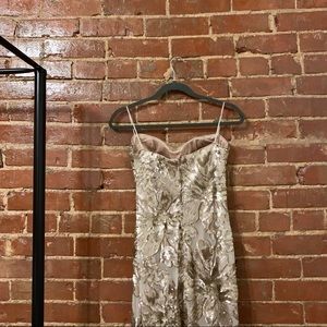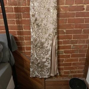 Strapless Marina gold sequin floral dress with mesh detail and slit in leg