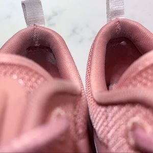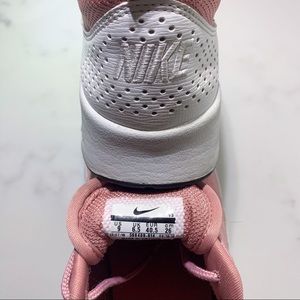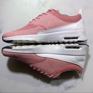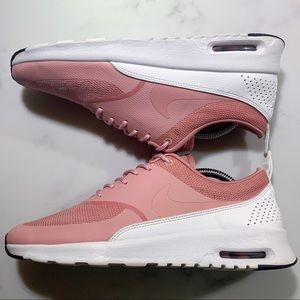 NIKE Air Max Thea in rust pink and white. These shoes are very clean with no scratches or stains. Shown in the last picture these did have small holes in the inside of the shoe in the heel cup area that have been repaired as pictured. The repairs aren’t visible when being worn. The tread has some wear on it as pictured so wouldn’t be suitable for running anymore but still enough grip for a gym or everyday walking shoe. Pictures are accurate of current condition. Woman’s size 9.