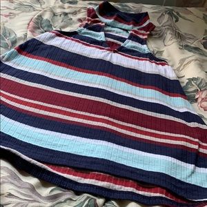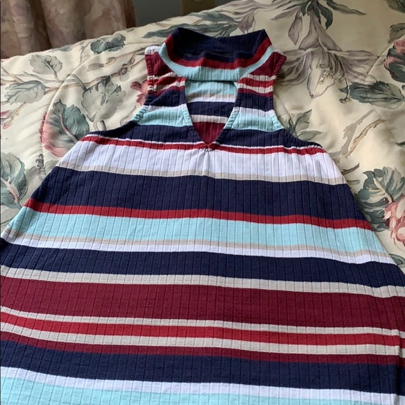Maroon, navy, aqua, red, and white striped tank top. Wear it as a flowy top or tuck it into a jean skirt for a body suit look! Very cute cutout on chest with mock neck detail.