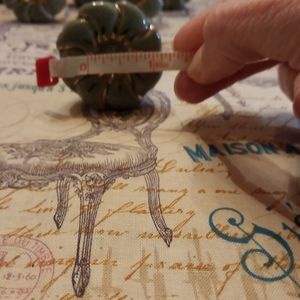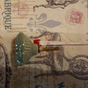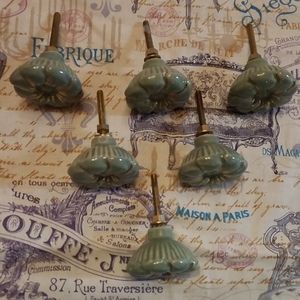 You are getting 6 bnwt green ceramic drawer pulls. The face of the pull looks like a flower with golden highlights. I took tags off for a project and didnt complete it. All are in like new condition no cracks or flaws. Please see pics for measurements.