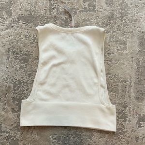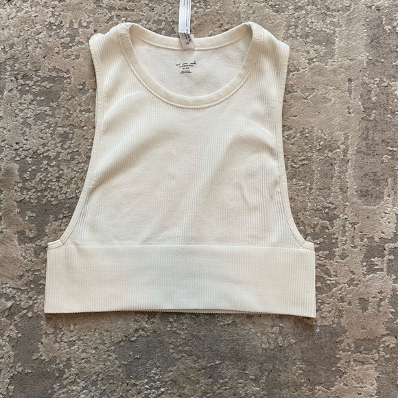Out from Under stretchy cream crop tank. Side of tank goes down very low so side boob will show (that’s the look it’s going for) . I paired it with a beige bra and it looked fine.