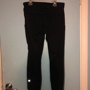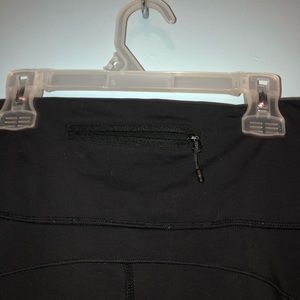 Another pair of Lululemons, super cute for yoga or running at night because of 2 reflective panels on the legs. Two pockets on the side of the thighs (no zipper) and two more card pockets in the waistband, as well as a zip pocket in the back. No size dot but fits like my other size 8s, cropped ~ 7/8 length. So cute, barely worn, no pilling!