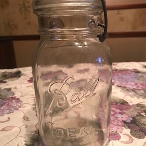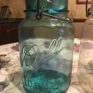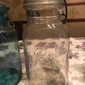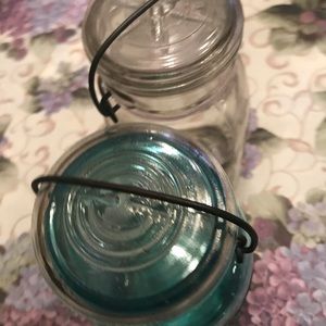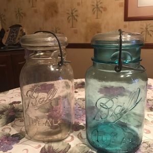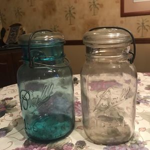Antique Ball jars for canning or storage. Metal tops fit on lids. Most likely 1960s. No chips or cracks. Blue jar has the number 4 on the bottom. Clear jar hasn’t a number..