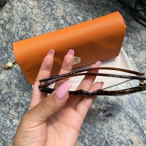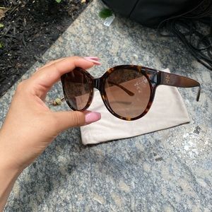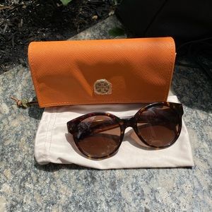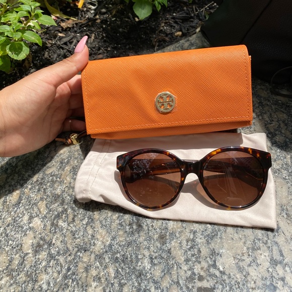 ( This is a pair of Tory Burch sunglasses with tortoise print! They are very flattering and can go with anything! I am including the dust bag and pouch. The logo on the pouch still has the plastic for protection. In pristine condition. They are also polarized.