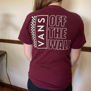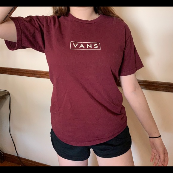 Super cute maroon vans tee! thick, durable material slight cracking on the lettering size small, true to size