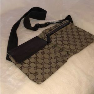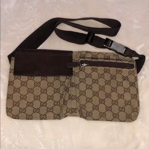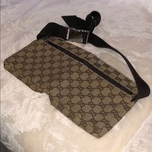 **SOLD**. Authentic Gucci Waist Bag (Fanny Pack). Used condition. Scratches on buckle. No rips or tears anywhere. Light Creasing on exterior. See pictures for line above front zipper.