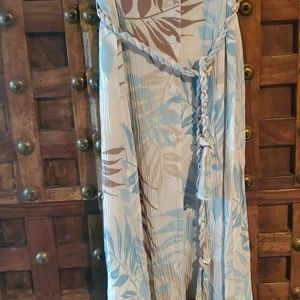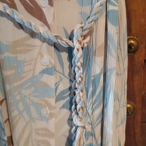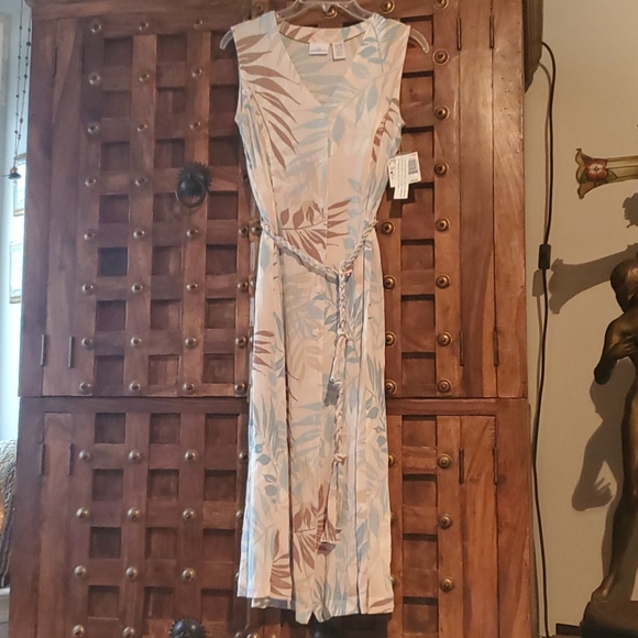 Super cute summer dress. Biege, light blue, brown leaves print. 100 % rayon. V neck , button down. Brand with tags. (14)