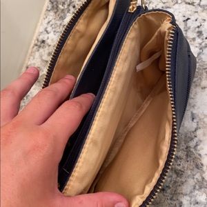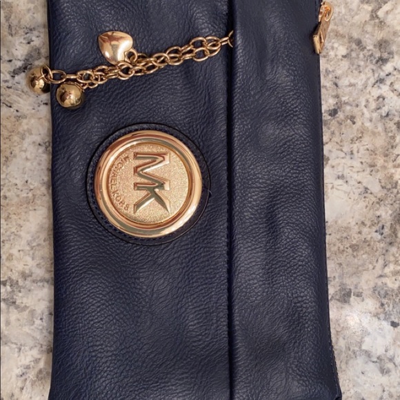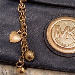 Navy blue Michael kors clutch purse. Shoulder strap is missing. Has charms on the front of it.