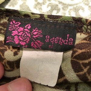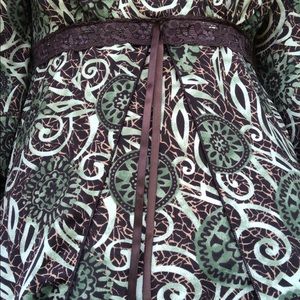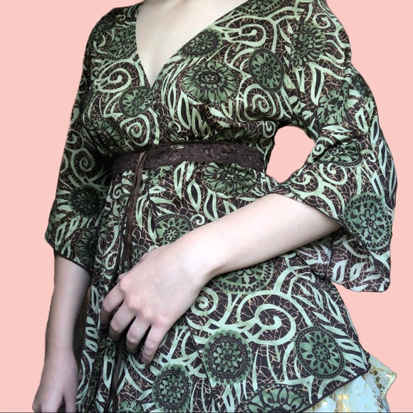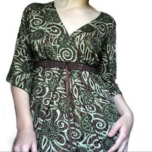 Agenda Beautiful Brown and Green Flowing 60s Hippie Stretchy 1/2 Sleeve Droopy Top with Curtain Panels and Lace Band with Two Silky Brown Strings
