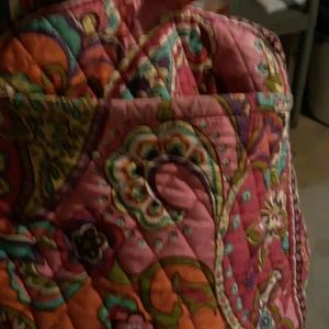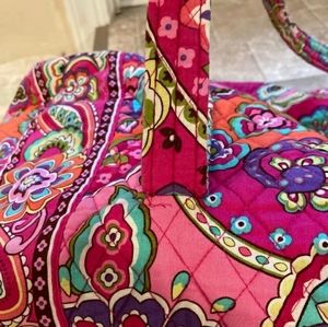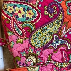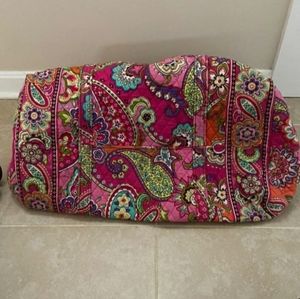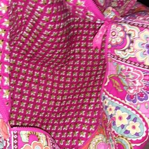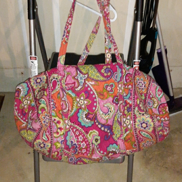 Huge super cute.pink flowery designed Vera Bradley bag. Use it for everyday use with daily errands or chores or even shoplubg trips or use it as a vacation or overnight bag. Theres tons of room in it! The zipper opening itself measures 20 in across but thw.entire.bag is close to if not 30 inches all thw way. Its huge! Barrly even used it so its almost like new GREAT SHAPE!!!