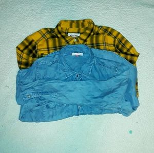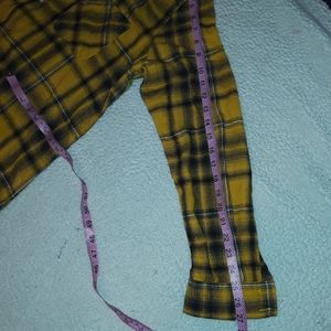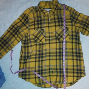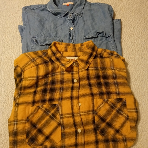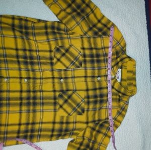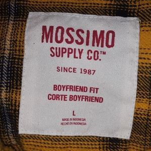 The Mossimo top is yellow with black plaid flannel. A very thin light flanel that is soft as well. Size Large.