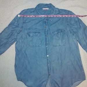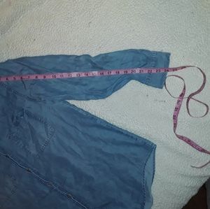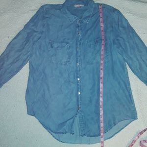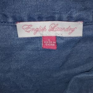 The English Laundry blouse is light blue with button down snaps. The material is very light and soft. Size Large