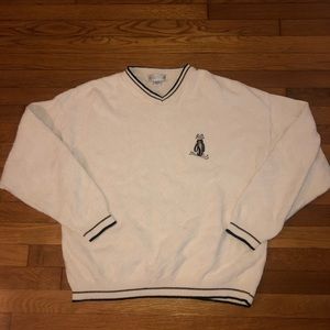 Vintage gold embroidered cable knit sweatshirt. Ivory color with black trimming. Perfect worn condition. Extremely comfortable! Golf club and caddy embroidery on left chest. 100% cotton.