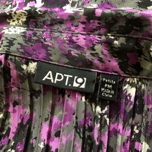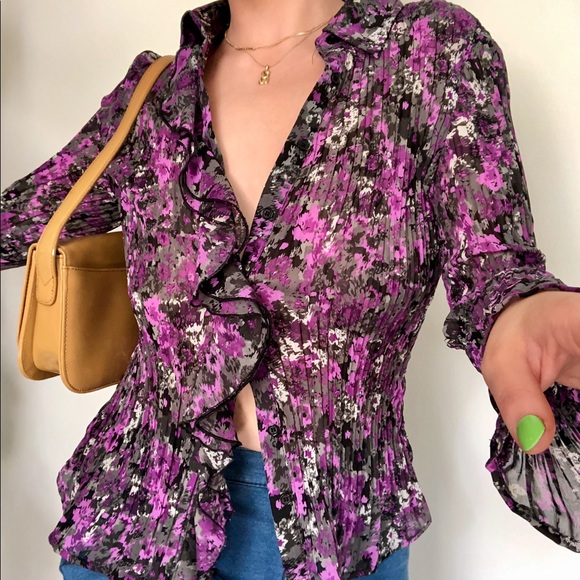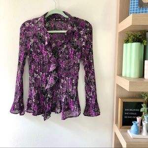 •semi-sheer blend of purples, white, gray & black with, flare sleeves & ruffles running down one side of the buttons