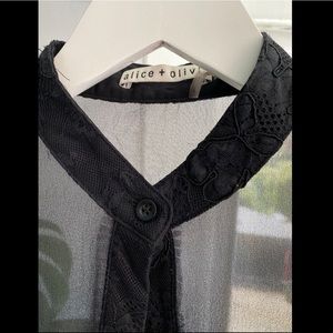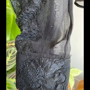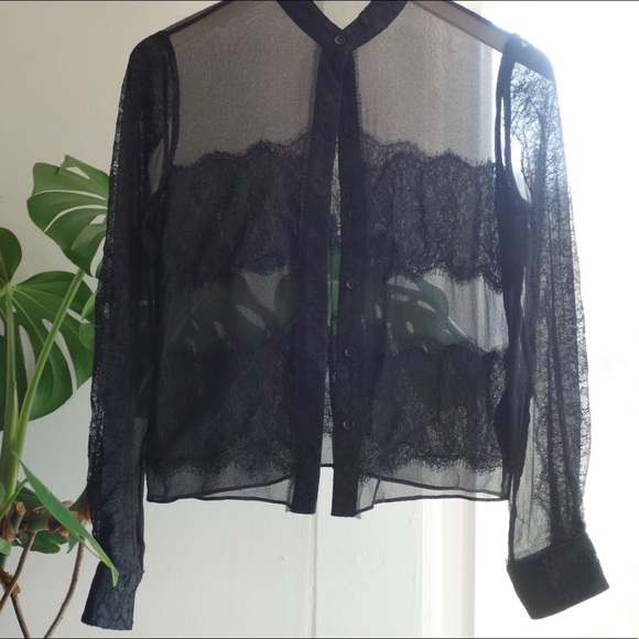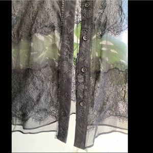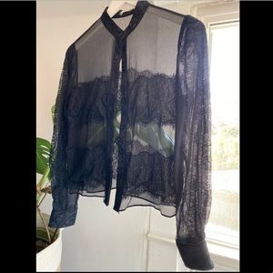 Dreamy black silk button down with gorgeous lace detailing throughout. It’s a top that can be easily layered for work or fun!