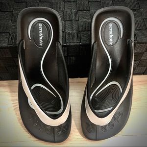 Women’s AEROTHOTIC comfort flip flop with arch support. Footprint design that reduces back and heel pain. Water resistant, everyday and casual wear. Light in weight. Matt Silver and black. Sz 8