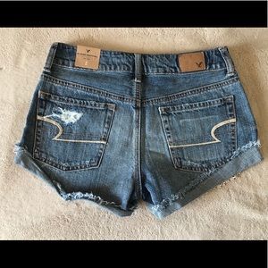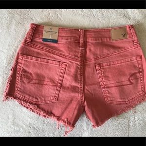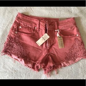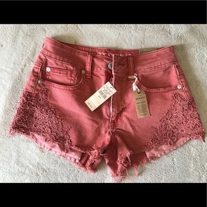 NWT American Eagle Outfitters Jean shorts size 2, one in denim and one in rust color with detailed pockets and designed lace fringe on sides. Never have been worn nor used, super cute for your summer closet. Comes from a smoke free and pet free home. Paid $50 for each pair, willing to sell both pairs for $20 or $9 for each.