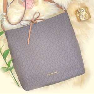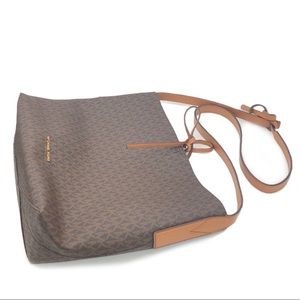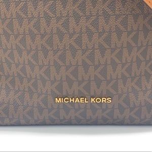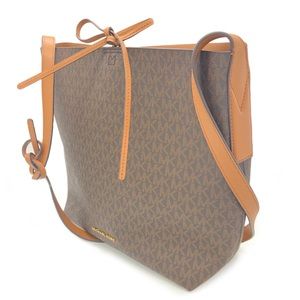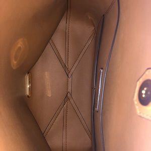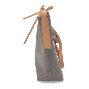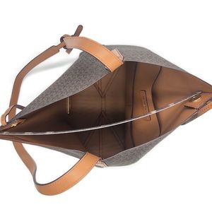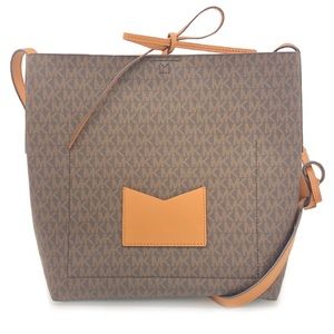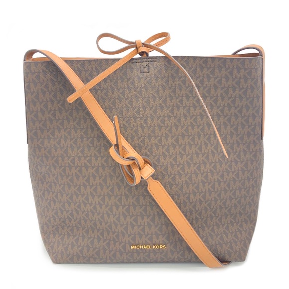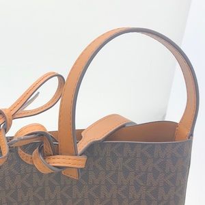 ◾️Features: 100 % Peebled leather,MK Monogram,back pocket,tie top,tan & leather interior,interior w/ 2 pouch pockets,buckle-less adjustable straps, small exterior pocket on back