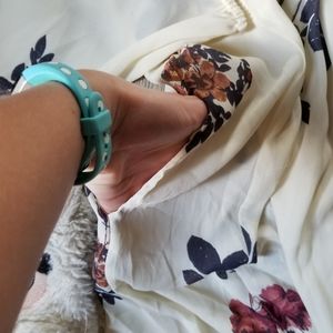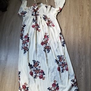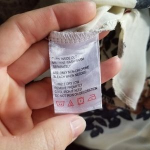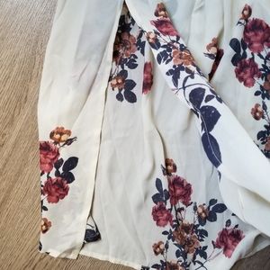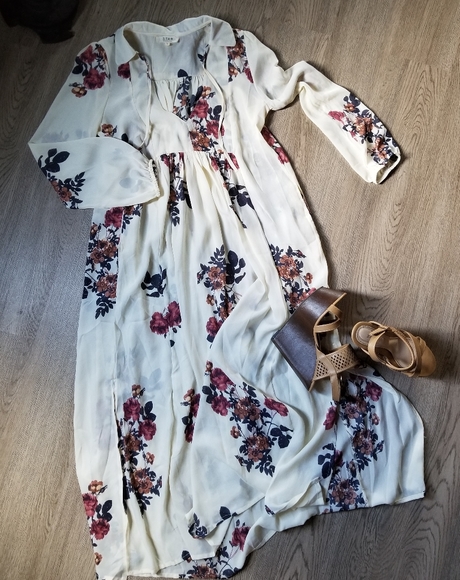 Size L, could fit a M or S, no stretch except sleeve cuffs, bought and never wore, been in closet, two side slits, pockets, super flowy, loose fit from waist down, 50" from shoulder to hem, 19" waist and chest, smoke and pet free home