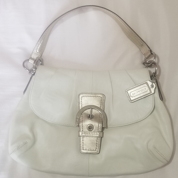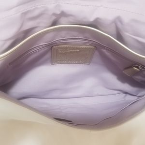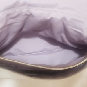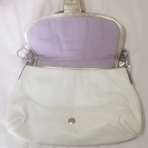 Color: Eggshell white with gold accents and silver hardware, beautiful lilac lining