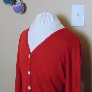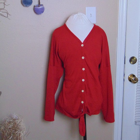 This adorable red sweater is great for colder weather. It will keep you warm outside but isn't so thick that you will be too hot inside. It has a cute little tie at the bottom of the sweater and buttons. Only worn once and is in like new condition. Size large.