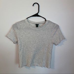 light gray, textured top with lettuce cut sleeves/bottom trim - never worn