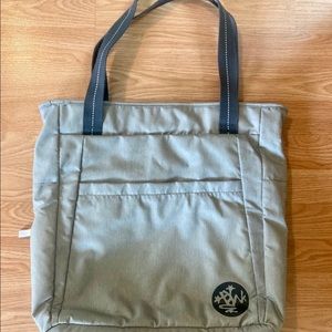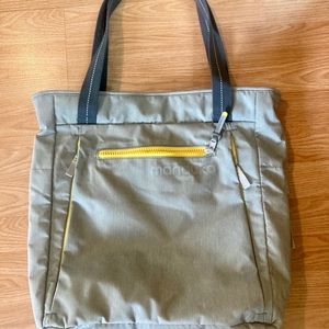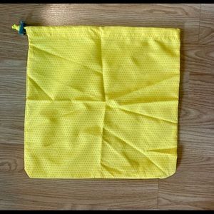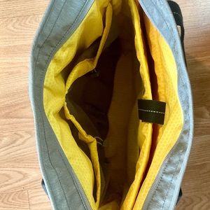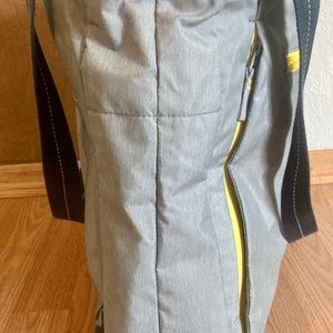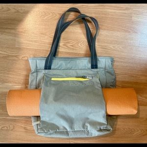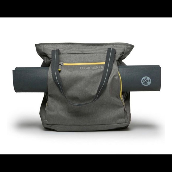 Brand new Manduka light grey and yellow, nylon yoga mat bag, never used before. Has padded inside pocket for laptop and 4 outer pockets. Includes medium yellow draw string bag.