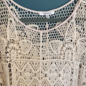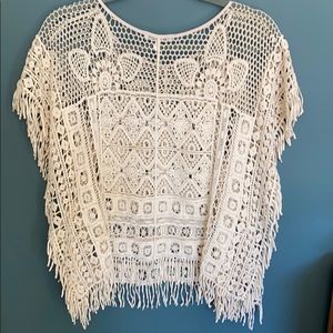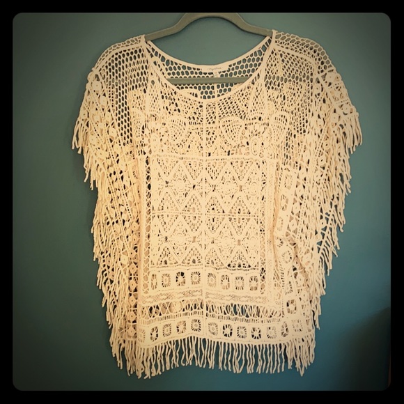 Gorgeous boho macramé esque poncho. Cream colored with beautiful detail and fringe. Mystree brand one size fits all. Worn once, great condition.