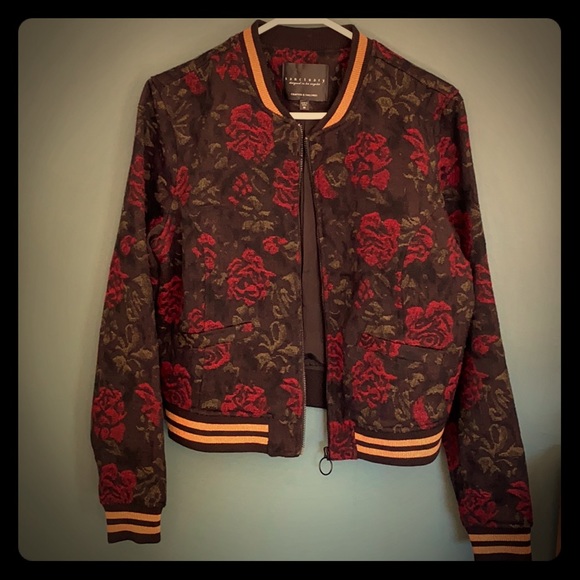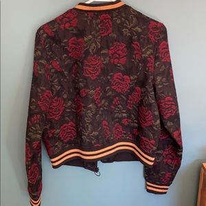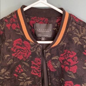 Varsity style jacket. Shell is 55% wool. Pretty woven rose pattern. Shimmery gold thread. Like new.