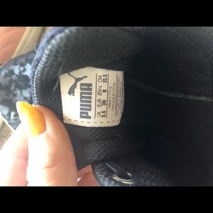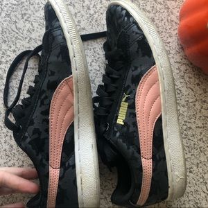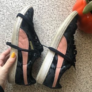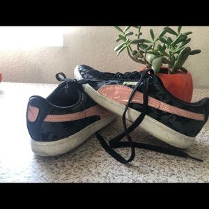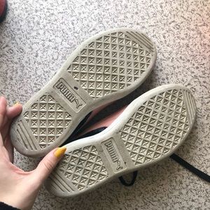 Black textured puma sneakers with pink accents!! Super cute and comfortable. Worn in but not used very often! Still in great condition.