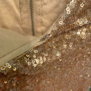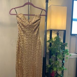 A beautiful gold sequin dress that is form fitting and drapes just right. It was worn once, the bar that holds up the top in v form is broken but can be glued together the v still holds up great due to this it has a small tear on the inner bra area that can be easily sewn (last picture)
