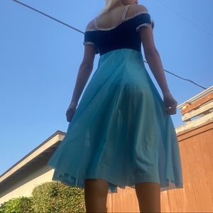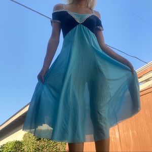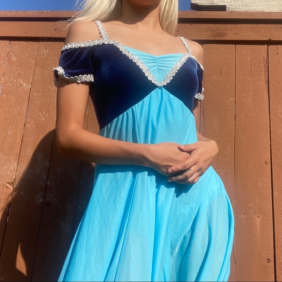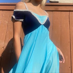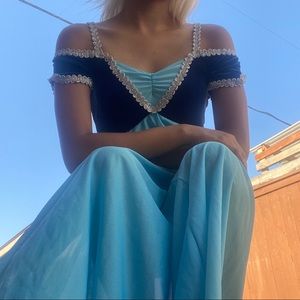 this vintage gown makes me feel like i’m living in a whole different time and i love it. the top part of the dress has silver detailing and velvet arms that go off the shoulder, with the whole rest of the dress flowing down a beautiful blue color 👗 (dress inside includes bodysuit)