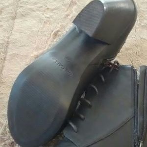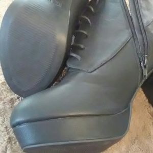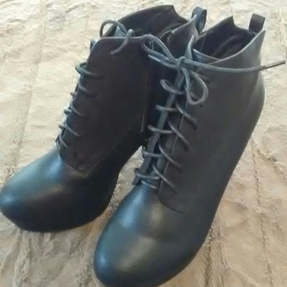 Black manmade uppers with stacked chunky high heels.Faux lace up front with side zipper.Nice quality..looks like leather. Never worn, perfect condition.